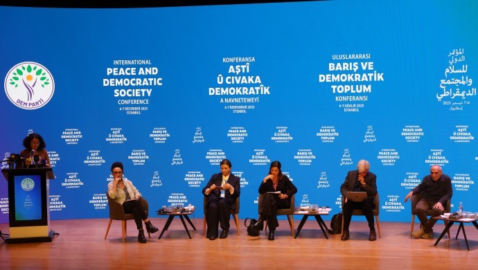 Ortadoğu’nun onlarca yıldır bir savaş merkezine çevrildiği, halkların birbirine düşman edildiği, halkların ortak yaşam iradesinin parçalandığı bu dönemde; demokratik çözüm ve barışçıl diyalog arayışı hepimiz için çok kıymetlidir. Silahlardan, baskılardan, korkulardan beslenen düzenin karşısına; sözü, iradeyi, müzakereyi ve halkların kardeşliğini koymanın zamanı çoktan gelmiştir, geçmektedir. Türkiye’nin de artık inkarla, ötekileştirmeyle ve ayrımcı politikalarla değil; demokrasiyle, hukukla ve toplumsal barışla, ortak yaşam iradesinin en güçlü şekilde yaşatıldığı yer olarak anılması gerekmektedir. Bunun yolu ise, gerçeklerle cesurca yüzleşmekten, geçmişin acılarını unutmadan; ama bu travmalara teslim de olmadan halkların ortak geleceğini birlikte kurma iradesini göstermekten geçer. Son olarak şunu söylemek istiyorum. Hepimiz için barış mümkündür. Demokrasi mümkündür. Birlikte, eşit ve özgür bir yaşam mümkündür. Unutmayın ki bu bir parçalanma, bölünme süreci değildir, zaten paramparça olmuş halkların onurlu birliğini sağlayacak tarihi bir süreçtir. Buna inanmaktan hiç vazgeçmeyelim. Bunun için mücadele edelim. Hepinizi sevgi ve saygıyla selamlıyorum. Konferansta emeği geçen herkesi kutluyor, teşekkürlerimi iletiyorum.